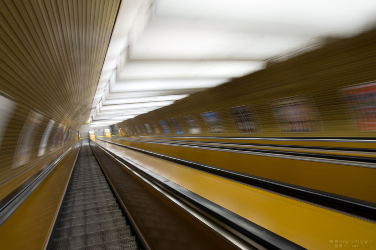 „Klatka schodowa” na stacji Želivského, której już sam kolor do najpiękniejszych nie należy, zaczyna się prezentować atrakcyjnie dopiero po rozmyciu niektórych szczegółów. Weźmy takie oświetlenie – zwyczajne świetlówki poprzedzielane białymi deskami, które na dłuższym czasie naświetlania wyglądają zupełnie inaczej. 29.12.2014