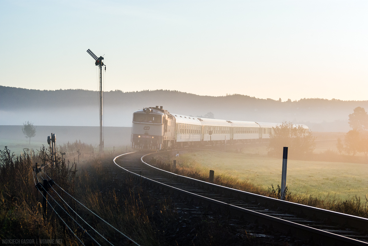 Poranny rychlík 846 z Trutnova do Pragi, prowadzony nurkiem 754 051-1, mija semafor wjazdowy do Červeného Kostelce. Efekty akustyczne – echo niosące się po całej dolinie – były jeszcze lepsze od wizualnych. 27.09.2009