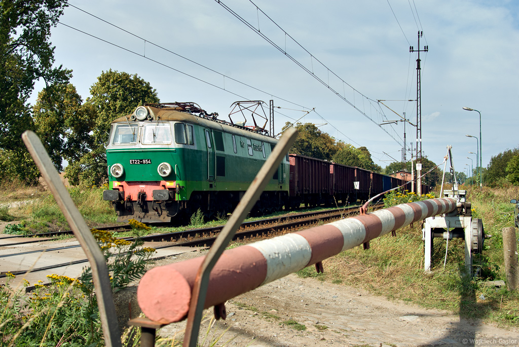 ET22-954 z – najprawdopodobniej – tarą oczekuje wolnej drogi na bocznym torze w Białym Kościele. Widocznej rogatki o napędzie mechanicznym oraz gruntowej nawierzchni już tutaj nie ma, drogę tę bowiem – jako dojazdową do pobliskiej żwirowni – zmodernizowano. 03.10.2009