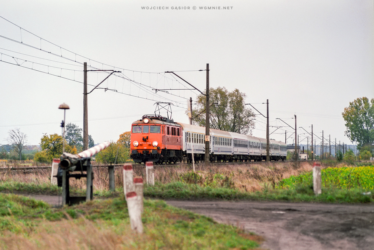 EP08-009, prowadząc Ex 6113 „Słowacki” z Wrocławia do Warszawy szlakiem Korzeńsko – Rawicz, mija przejazd na polnej drodze, wyposażony w mechaniczne zapory. 2008-10-16