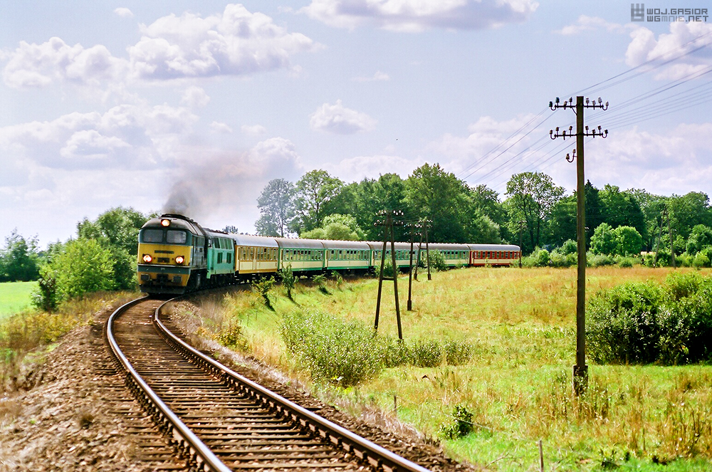 Cimochy – Wasilówka. ST44-1081 i SU45-045 prowadzą pociąg pospieszny „Hańcza” z Warszawy do Suwałk. Kadr trochę bez sensu, bezmotyw i pod słońce, ale jakoś tak mi się po tych 12 latach podoba, pewnie po części dlatego, że udało się to jakoś obrobić i wydobyć odpowiednią kolorystykę. 10.08.2006