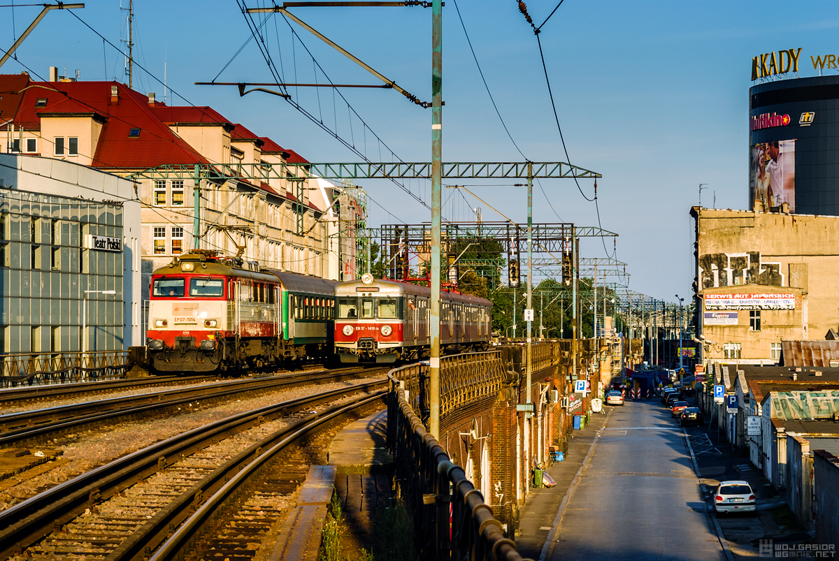 Spotkanie pod semaforami wjazdowymi do Wrocławia Głównego. Pociąg pospieszny 65501 „Niegocin” do Ełku, prowadzony EP07-1014, wyrusza ze stacji początkowej w długą podróż, a obok na wjazd i zakończenie kursu oczekuje EN57-1410. Foto powstało zasadniczo dlatego, że prawy tor był wówczas zamknięty. Inaczej nie odważyłbym się tutaj łazić. 15.08.2009