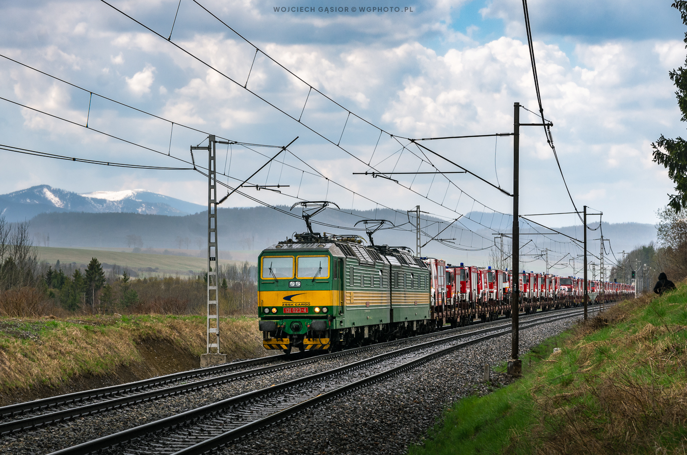 131.023+024 z ładunkiem sprzętu strażackiego (jadącego docelowo do Ukrainy?) zbliża się do stacji Štrba. Z zaskoczenia nas wziął, stąd np. zakapturzona postać w kadrze. 😉 03.05.2022