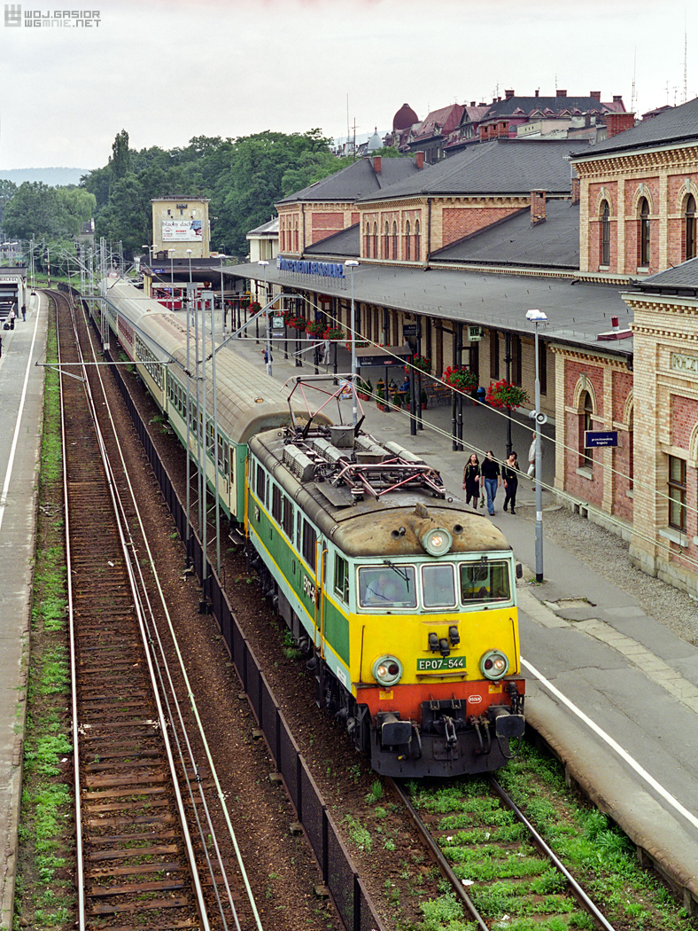 EP07-544 z CM Lublin – jedyna siódemka 303E bez ryfli (ex ET41) – odjedzie z poc. posp. 42100 „Sztygar” do Lublina spod pięknego budynku dworca w Bielsku-Białej. Dziś równie ładnie wyremontowanych obiektów jest wiele, wtedy był to wyjątek. 16.07.2004