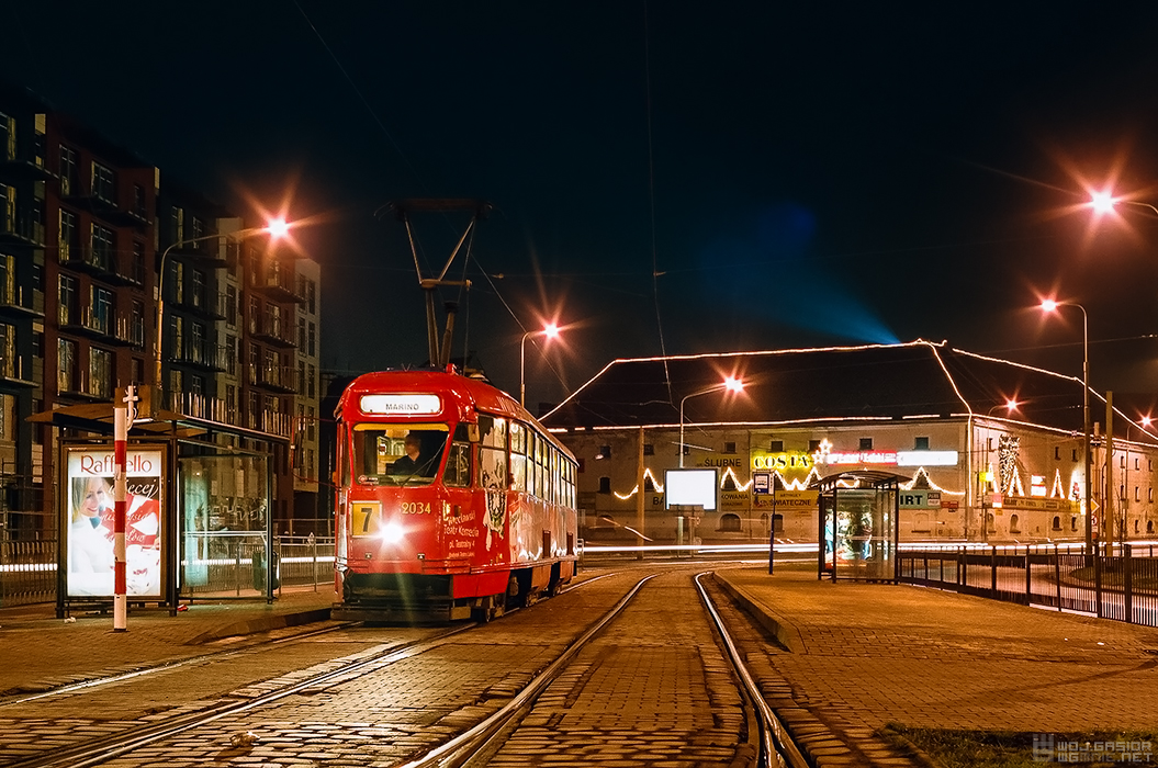Wrocław, ul. Władysława Jagiełły. Oświetlony budynek widoczny w tle to hurtownia ozdób choinkowych, obecnie przeniesiona w inne miejsce, lecz wciąż lansująca się trudnym do przeoczenia oświetleniem. 30.12.2006