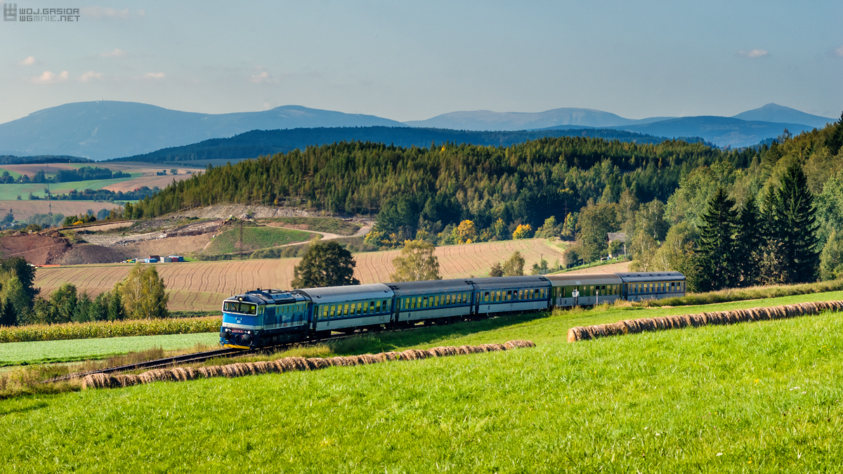 750 714-8 z rychlikiem 854 „Cidlina” relacji Trutnov hl.n. – Praha hl.n. nabiera prędkości po krótkim postoju na przystanku Rtyně v Podkrkonoší (który po polsku mógłby się nazywać mniej więcej jak w tytule, gdyż rty to usta). Kadr z grzbietem Karkonoszy jest standardowy, ale popołudniowa pora mu nie sprzyja. 30.09.2012