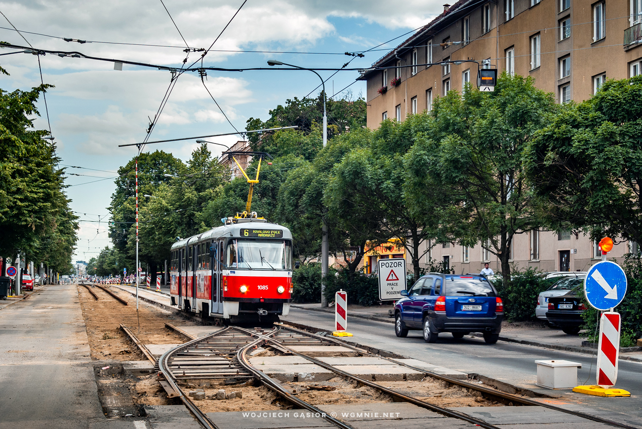 Brno, Palackého třída, Tatra K2P 1085 zjeżdża z tymczasowego jednotoru. 21.07.2009