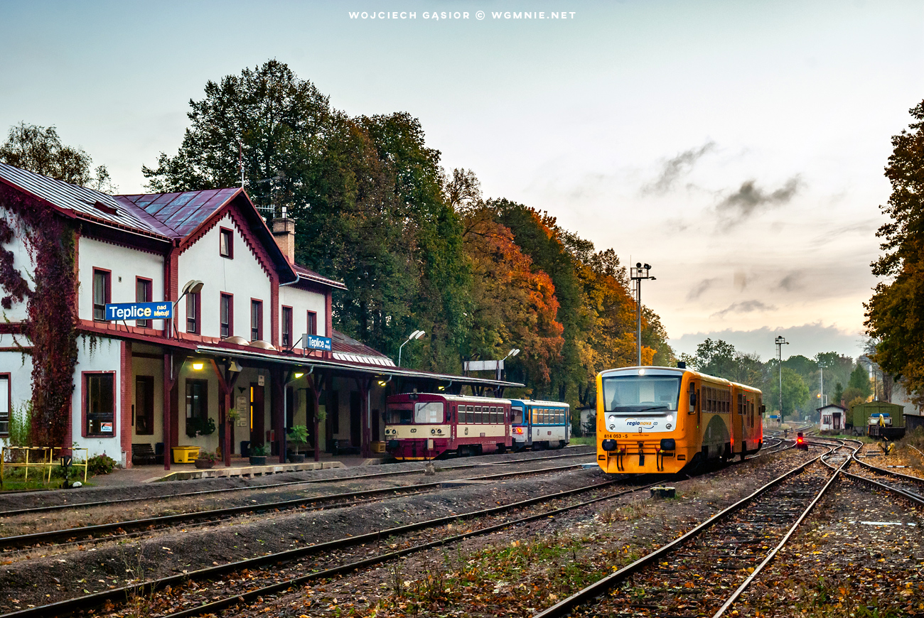 …poranka i motoraków na stacji Teplice nad Metují. 814.053 pojedzie do Náchodu, a jedna z 810-tek spod budynku stacyjnego odjedzie do Trutnova. [13.10.2012]