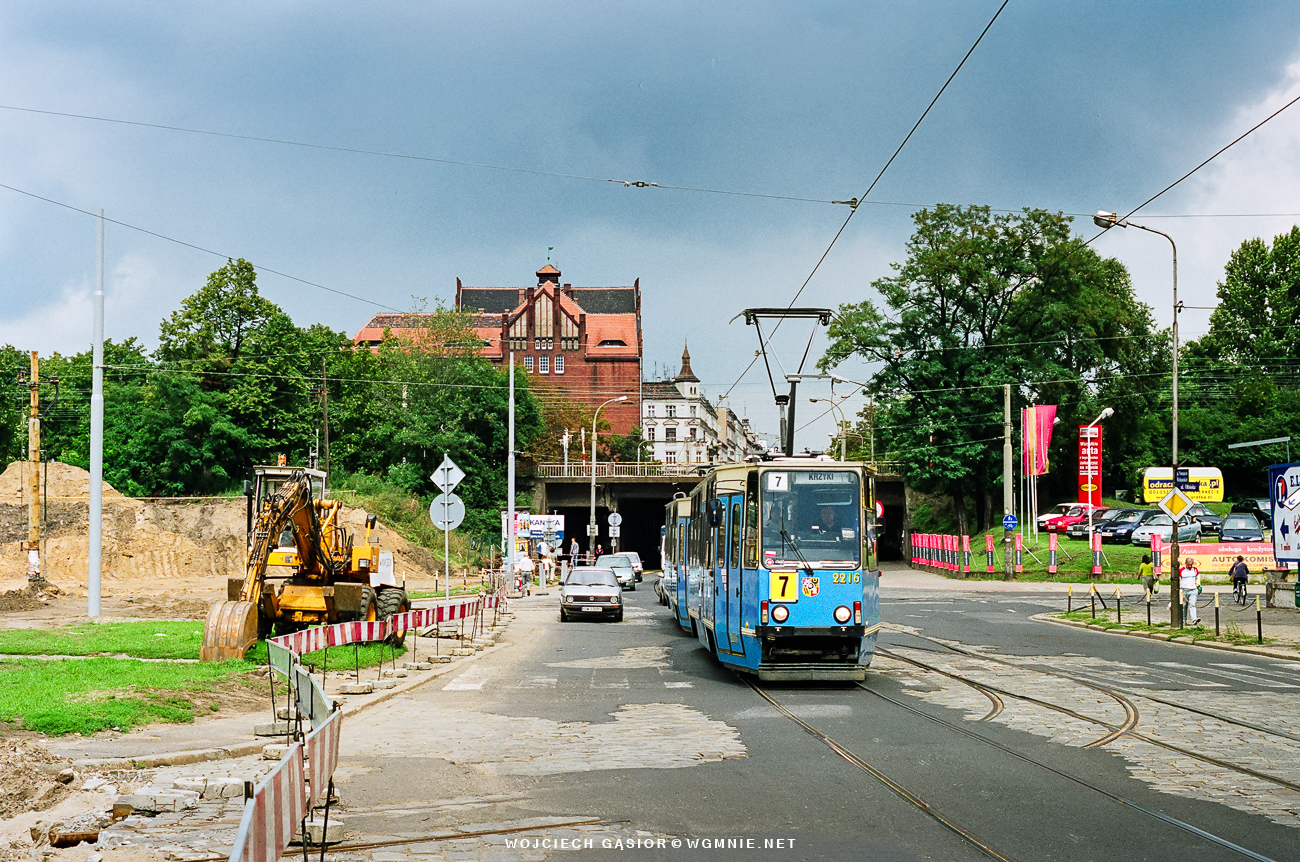 Skład 105Na 2216+2217 mija rozkopany plac Powstańców Wielkopolskich we Wrocławiu jadąc torem wybudowanym na potrzeby zmienionej organizacji ruchu (relacja ta pozostała po przebudowie i jest używana awaryjnie). Wyraźnie widać przebieg używanego jeszcze do niedawna łuku z placu w ulicę Trzebnicką. 22.08.2006