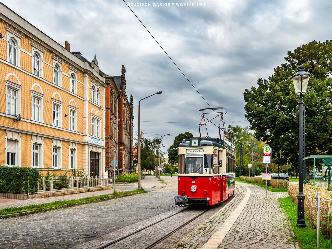 Naumburg, Jägerstraße. Jedyny tramwaj w pustym mieście. W roli głównej występuje wagon Reko TZ70 nr 51. 19.08.2021