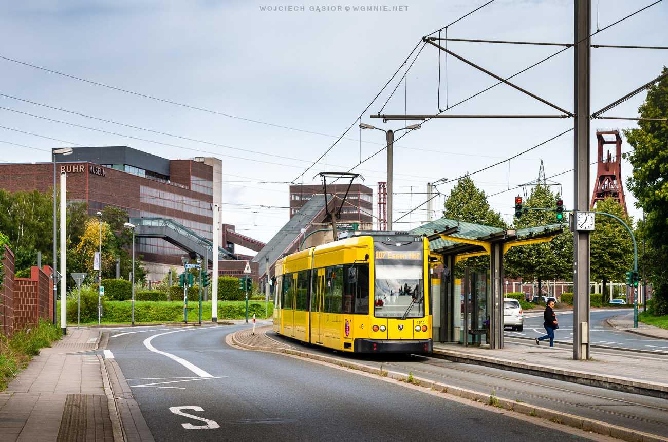 Essen, Gelsenkirchener Straße, przystanek Kapitelwiese. Bombardier linii 107, łączącej dworce główne w sąsiadujących miastach Gelsenkirchen i Essen, podczas postoju na przystanku zlokalizowanym w pobliżu kompleksu Zollverein. Teren dawnej kopalni i koksowni, zamkniętych w 1986 roku, zrewitalizowano i udostępniono zwiedzającym. Po prawej widać charakterystyczny szyb nr 12, będący jednym z symboli miasta. Całość znajduje się na liście Unesco. Szkoda, że przemysłowe dziedzictwo Górnego Śląska nie doczekało się podobnej ochrony. 20.09.2023