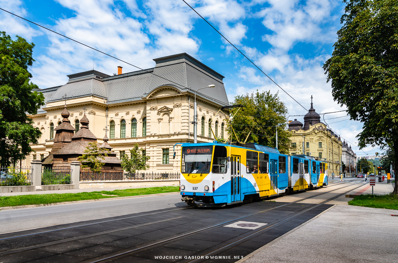 Koszyce, Hviezdoslavova ul. Tatra KT8D5 537 mija Muzeum Wschodniosłowackie, na terenie którego w ramach ekspozycji stoi drewniana cerkiew pw. Św. Mikołaja z 1741 roku, przeniesiona tu ze wsi Kožuchovce już w roku 1927. 16.08.2019
