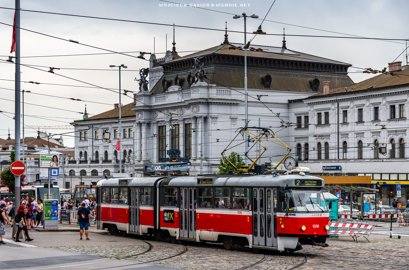 Brno, Nádražní ul. Tatra K2T 1038 odjeżdża spod dworca głównego. Jest to najprawdopodobniej moje ostatnie foto przegubowej Tatry w regularnym ruchu w Brnie. Wagon odstawiono dwa lata później, ale nie skupiałem się na uwiecznianiu końca eksploatacji kadwójek, ponieważ mam wiele starszych zdjęć z tymi pojazdami. 30.08.2020