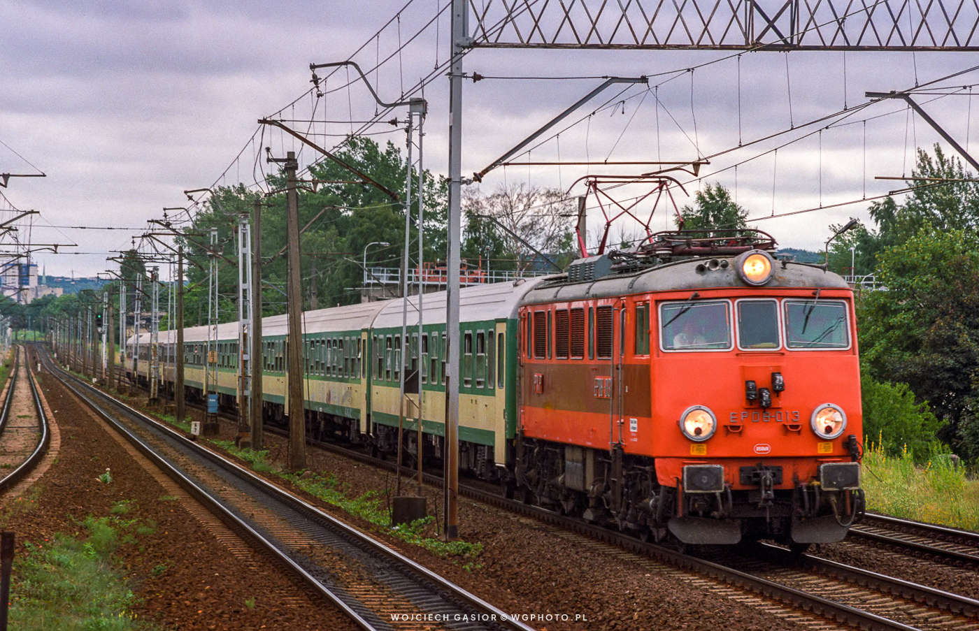 EP08-013 z pociągiem 3501 IC „Lajkonik” Kraków Gł. – Gdynia Gł. za parę minut zatrzyma się w Gdańsku Oliwie. 11.07.2002