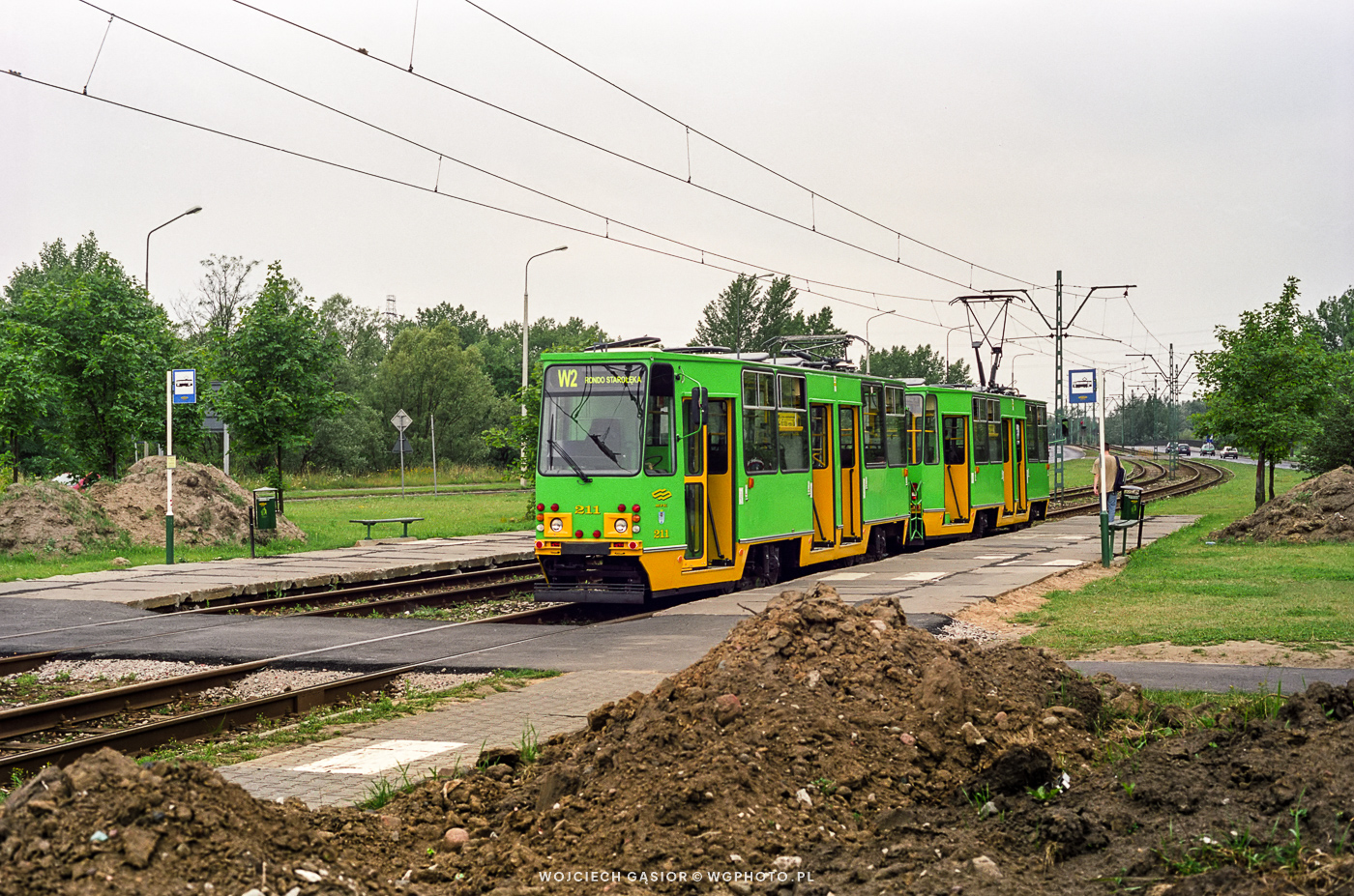 Poznań, ul. Hetmańska. Skład 105NaDK 212+211 na końcowym przystanku wahadłowej linii W2 przy Rondzie Starołęka. Miejscowe warsztaty przebudowały dwie pary stopiątek, montując na tylnym pomoście drugiego wozu kabinę. Taki tramwaj mógł kursować wahadłowo po jednym torze i obsługiwać przystanki zawsze z jednej strony. 24.07.2004