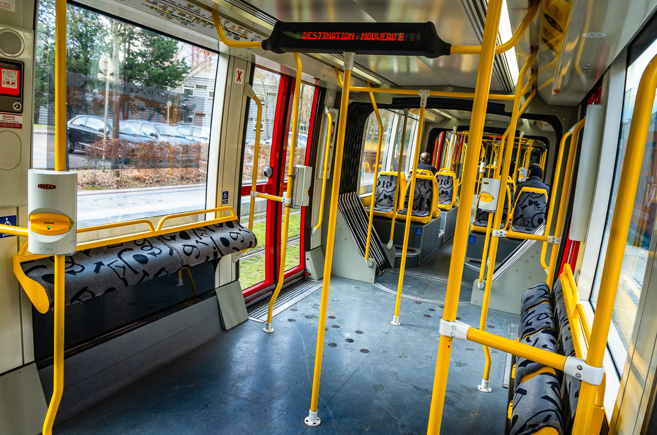 Wewnątrz Alstoma z Miluzy (zresztą to standard w tego typu pojazdach w tym rejonie świata) mamy paradoks z polskiego punktu widzenia, gdzie oczekuje się jednocześnie mnóstwa miejsc siedzących, a jednocześnie, przy naszych standardach napełnień (znacząco wyższych od zachodnich – napełnieniach, nie standardach) potrzeba wielu stojących. Gdyby więc w Polsce ktoś zamówił taki tramwaj, od razu podniósłby się krzyk, że taka „rzeźnia” bez foteli. A tymczasem wystarczająco miejsc siedzących umieszczono nad sztywnymi wózkami. Tutaj więc mamy duuużo miejsca na wózki i rowery, a w razie ich braku można skorzystać z rozkładanych foteli w pozycji siedzącej lub „poddupników” w stojącej – co kto lubi. 20.03.2018