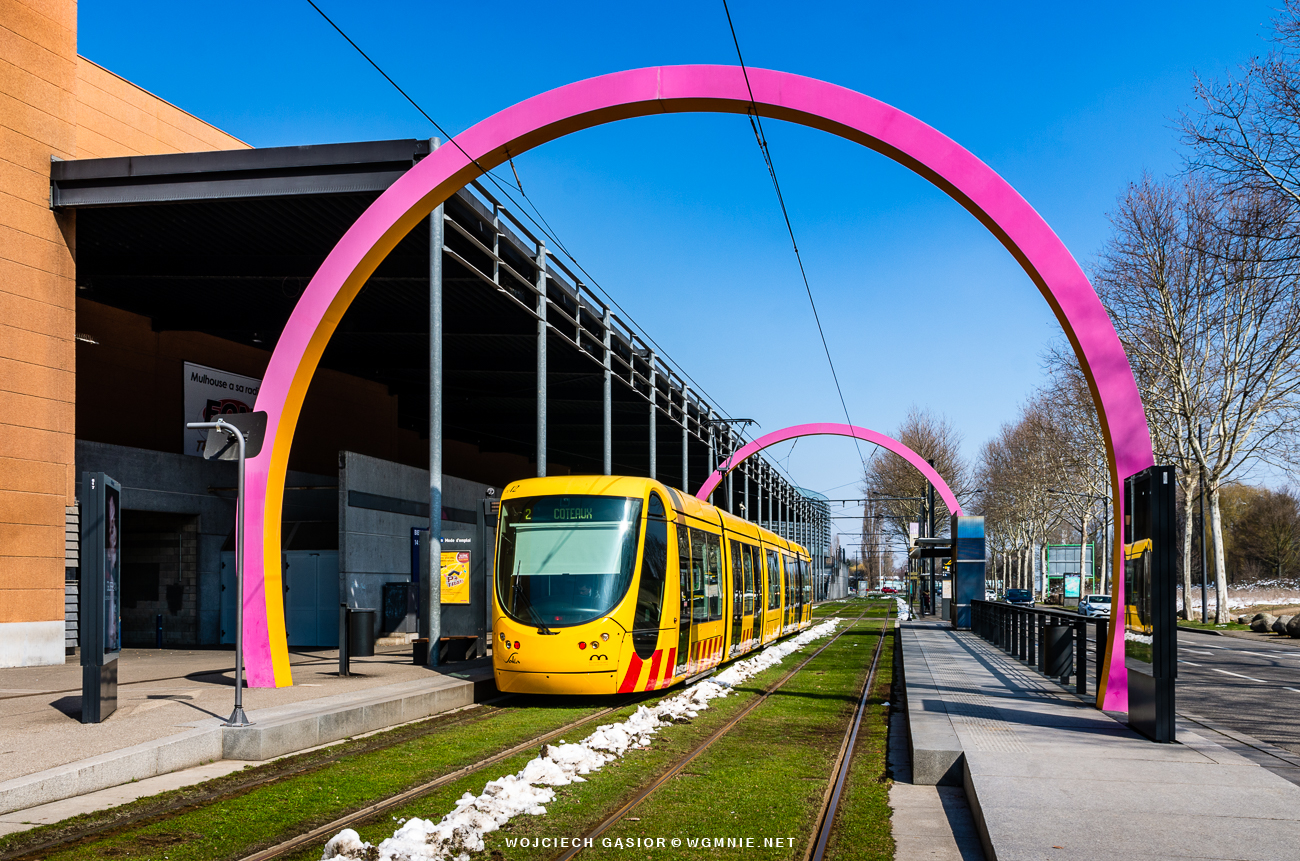 Miluza, kraniec Nouveau Bassin. Citadis302 nr 2012 czeka na odjazd w pięknym słońcu, które wcale nie oznaczało wiosennego ciepła, o czym zresztą świadczy śnieg na międzytorzu. 20.03.2018