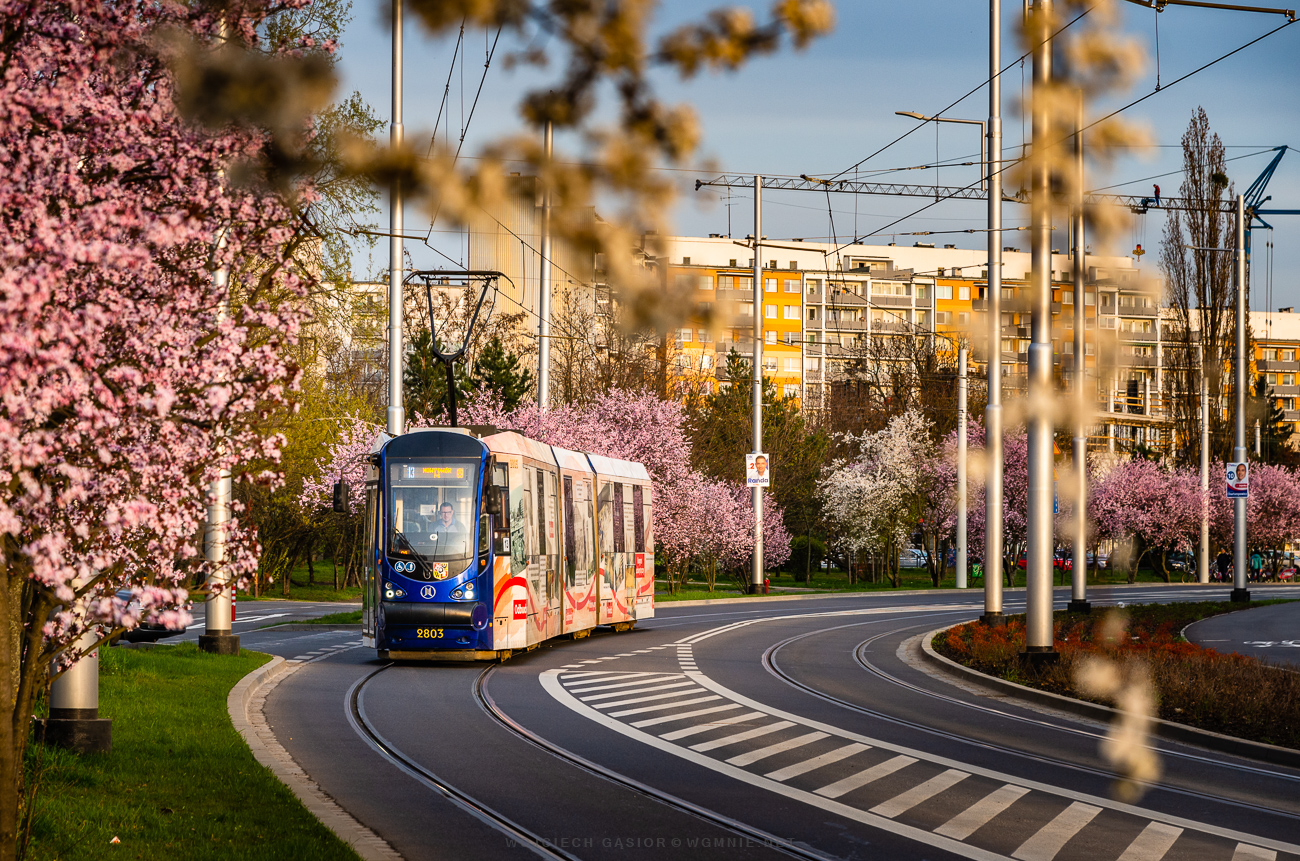 Wrocław, ul. Rogowska, Moderus Beta MF19AC 2803 na najnowszej trasie w mieście. Wczoraj pierwszy raz wybrałem się tam z aparatem, zachęcony drzewami obsypanymi kwieciem. 20.03.2024