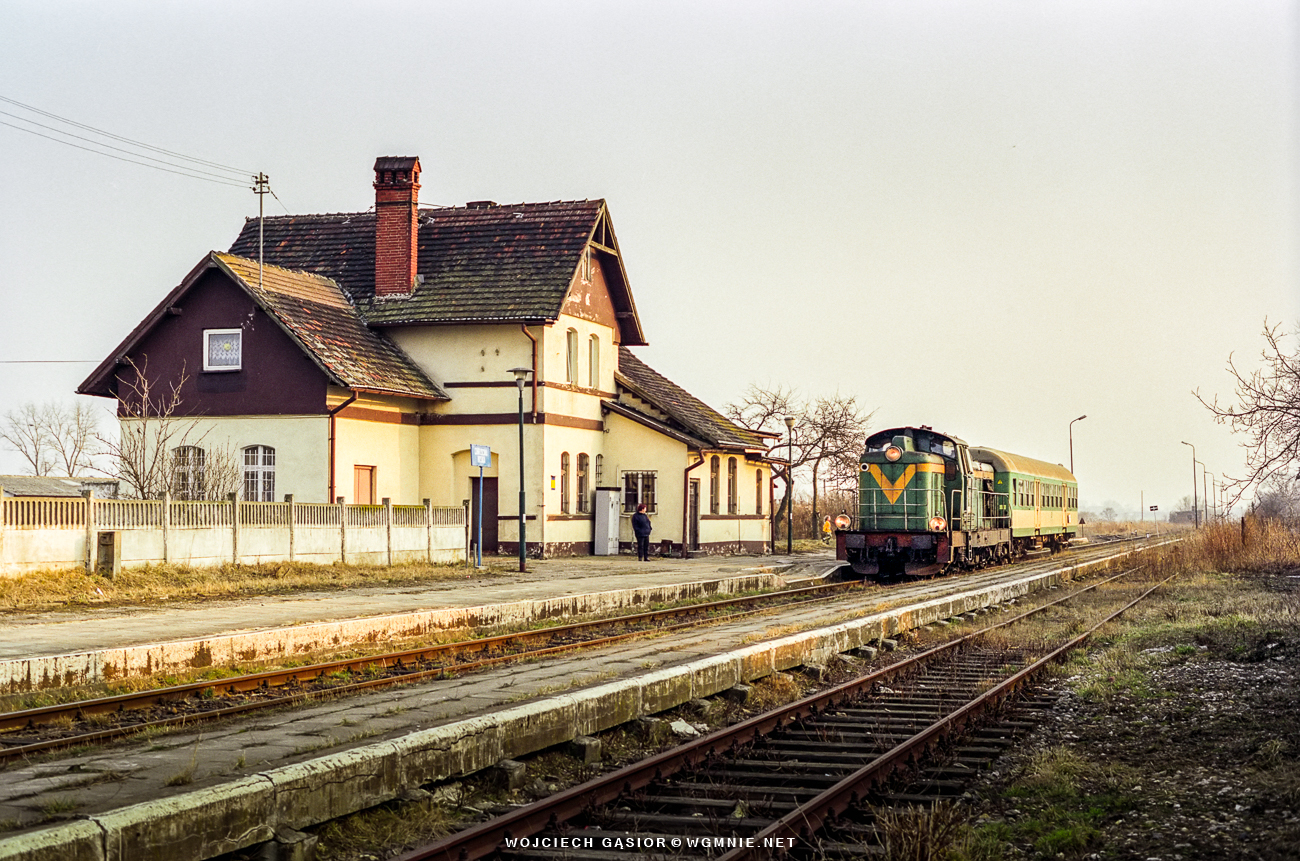 SP42-191 z popołudniowym pociągiem osobowym 66333 relacji Nysa – Brzeg zatrzymuje się przy peronie nieczynnej stacji w Chróścinie Nyskiej. 24.03.2005