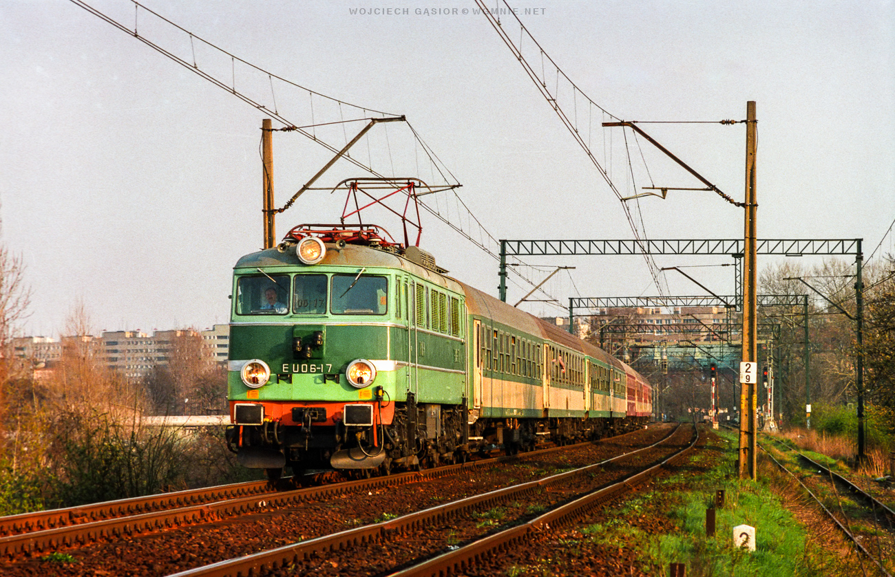 EU06-17 z pociągiem pospiesznym 38103 „Światowid” z Przemyśla do Szczecina na szlaku Podg Grabiszyn – Wrocław Mikołajów. Była to jedna z pierwszych lokomotyw w takich barwach, jakie pojawiły się chwilę po zniesieniu obowiązku malowania czół na żółto. O ile pamiętam, pierwsze maszyny pochodziły z CM Kraków i zostały przemalowane jeszcze w macierzystej lokomotywowni, nie zaś w zakładach naprawczych podczas obsługi wyższego poziomu. 08.04.2002