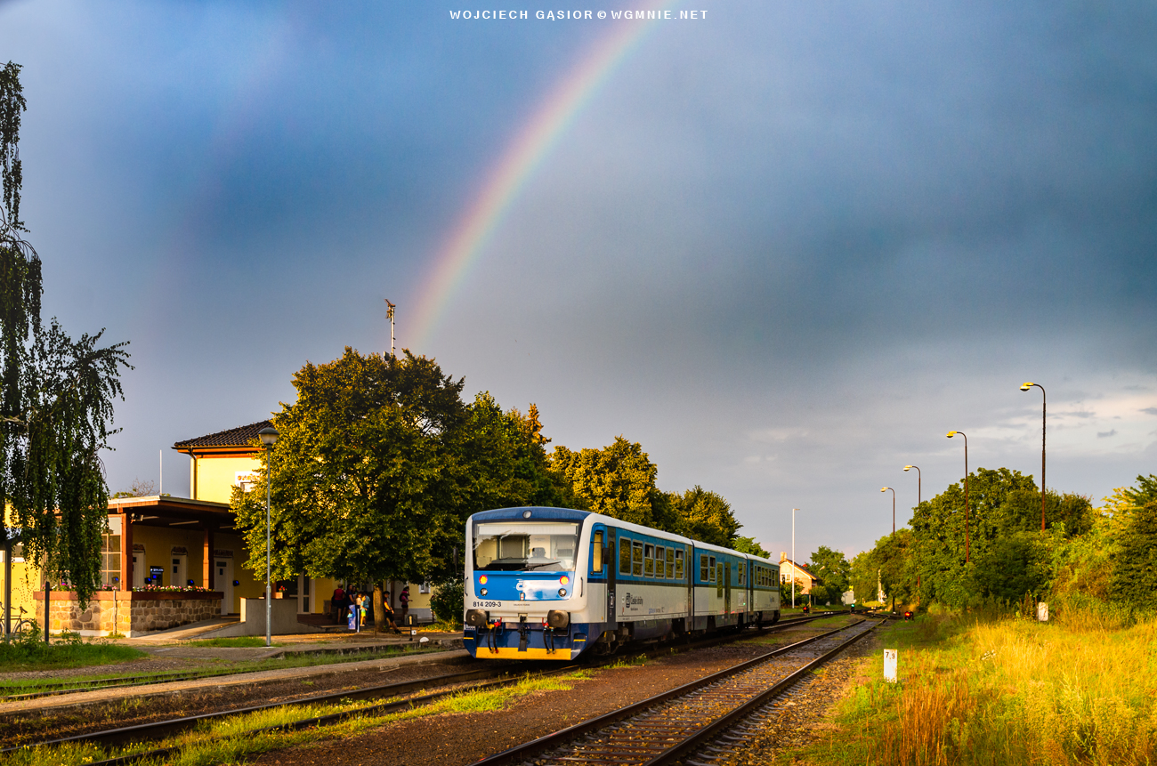 814.209 jako pociąg osobowy relacji Hodonín – Velká nad Veličkou zatrzymuje sie na stacji Strážnice, nad którą przed chwilą przeszła letnia ulewa. 29.08.2020