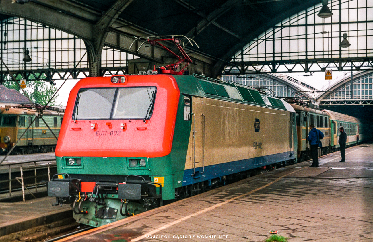 EU11-002 i EU07-201 z pociągiem pospiesznym 37102 „Ślązak” z Zielonej Góry do Krakowa Głównego przed odjazdem z Wrocławia Głównego. Nowoczesna maszyna była podsyłana na testy na CMK. 08.05.2001