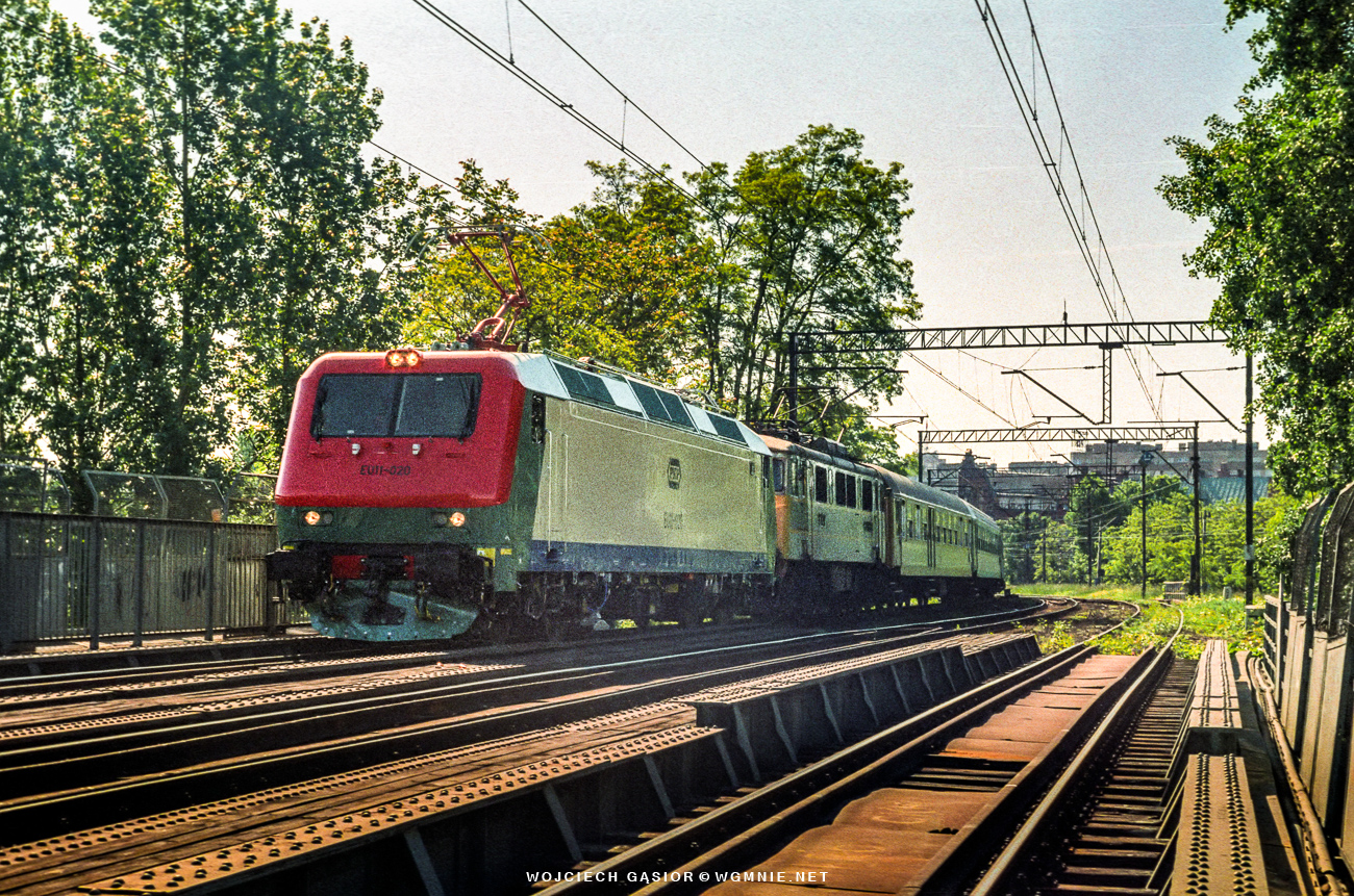 EU11-020 wraz z EU07-189 na czele pociągu pospiesznego 61111 „Mamry” z Wrocławia Gł. do Ełku mijają Podg Grabiszyn. To był jedyny raz, kiedy trafiłem EU11 jadącą na testy w kierunku Poznania, być może do Żmigrodu. 23.05.2001