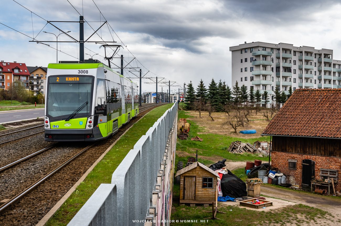 Olsztyn, ul. Tadeusza Płoskiego, Tramino 3008 w drodze do krańca na osiedlu Jaroty. Wszystkie tramwaje w mieście są dwukierunkowe, gdyż wszystkie krańce pozbawione są pętli. 24.04.2021