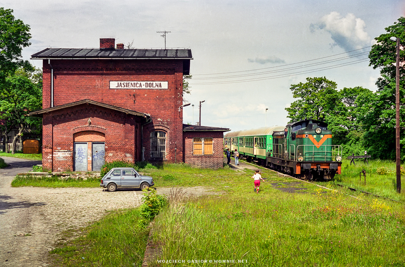 SP42-067 z pociągiem osobowym 9937 relacji Opole Główne – Nysa zatrzymuje się w Jasienicy Dolnej. 28.05.2004