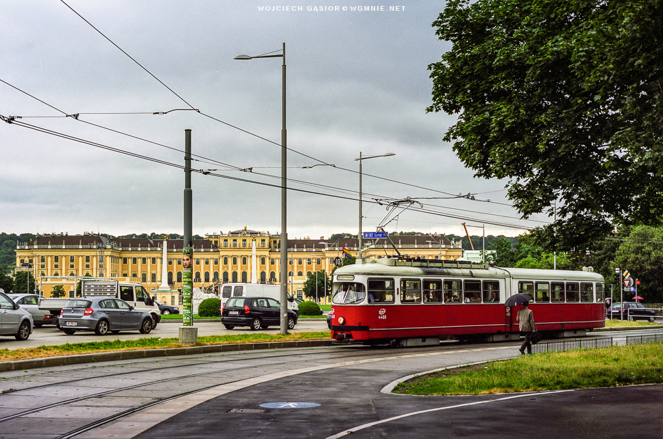 Wiedeń, Schlossallee. Wagon E1 4468 mija znany pałac, z którym chyba nie da się lepiej sfotografować tramwaju. 30.06.2006