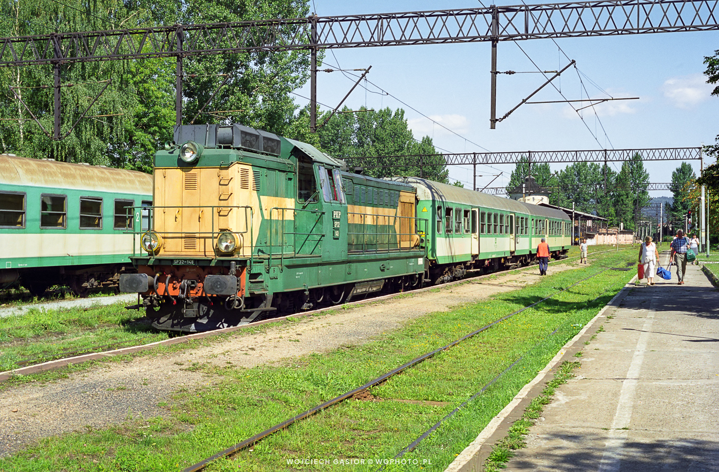 Pociąg osobowy 8032 z Wałbrzycha Głównego przywiózł garstkę pasażerów na peron, który dziś już nie jest używany. Obsługę trakcyjną zapewniła SP32-148 z wałbrzyskiej sekcji CM Wrocław. W rejonie Kłodzka wolałbym spotkać kamieniecką maszynę, gdyż wałbrzyskie były mi dobrze znane (i obfotografowane) z linii lubawskiej. 07.08.2003