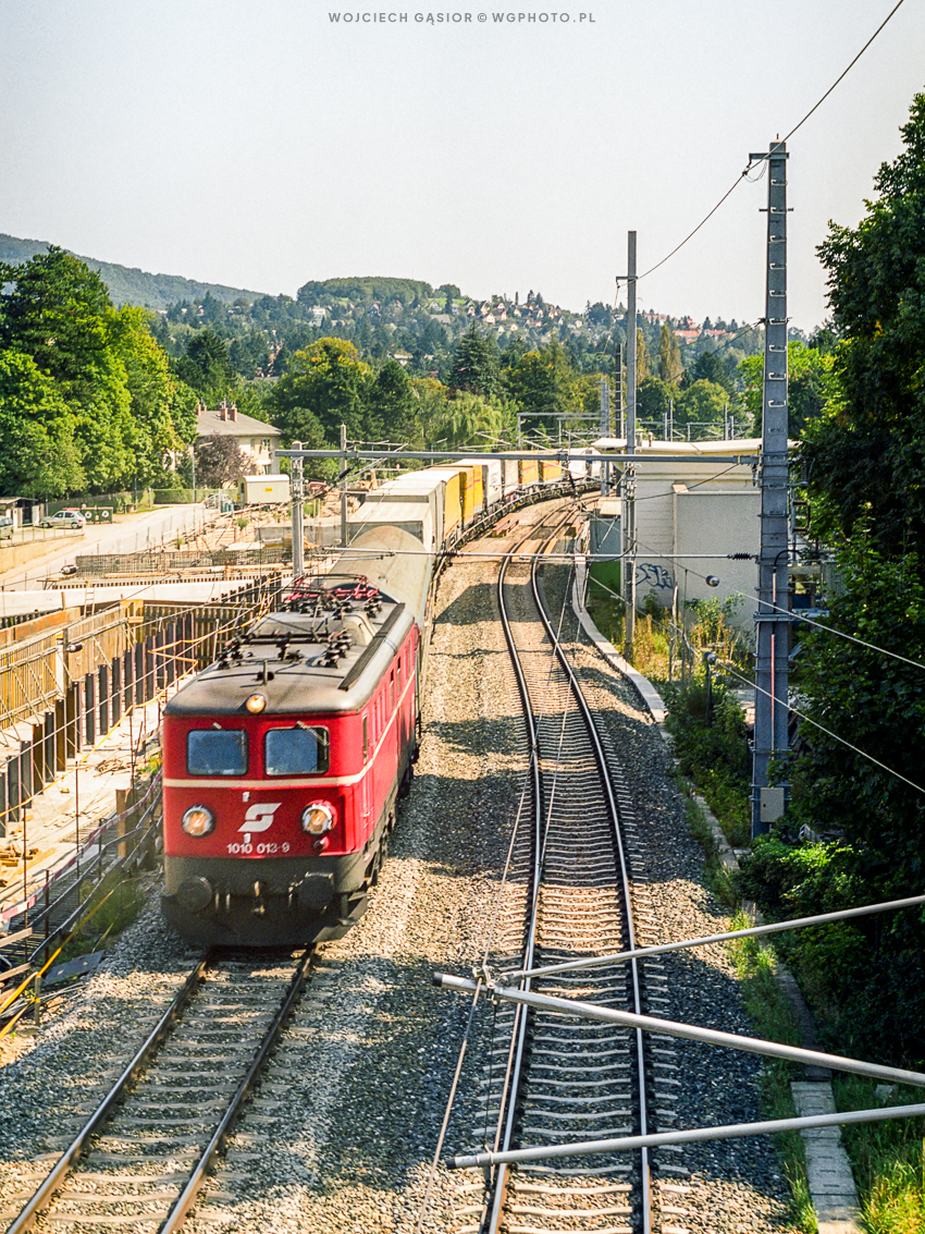 1010.013 z naczepami i wagonem sypialnym dla kierowców jedzie z Wiednia na zachód. Obok trwa budowa nowego wyjścia Westbahn ze stolicy Austrii. Trasa ta, oddana do użytku w grudniu 2012 roku, znacząco skróciła czas jazdy na odcinku z Wiednia do St. Pölten. Hadersdorf-Weidlingau, 07.09.2002
