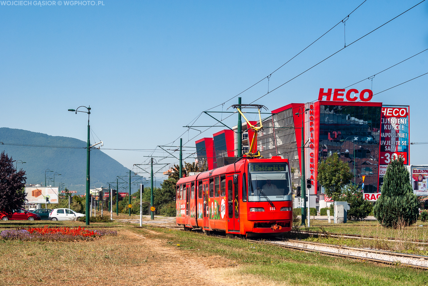 Ilidža, ul. Džemala Bijedića. Satra II (tak nazywają tu sobie zmodernizowaną Tatrę K2) nr 506 pod kolor centrum handlowego. 24.08.2011