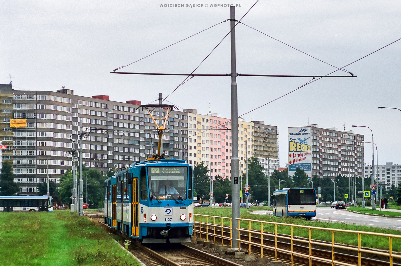 Ostrawa, Horní ul. Souprava T6A5 1127+1123 jadąc jako linia 17 do pętli przy Vřesinské ul. w dzielnicy Poruba zostawia w tyle bloki Dubiny. Tytułowe i reklamowe Řecko to Grecja. 12.09.2007