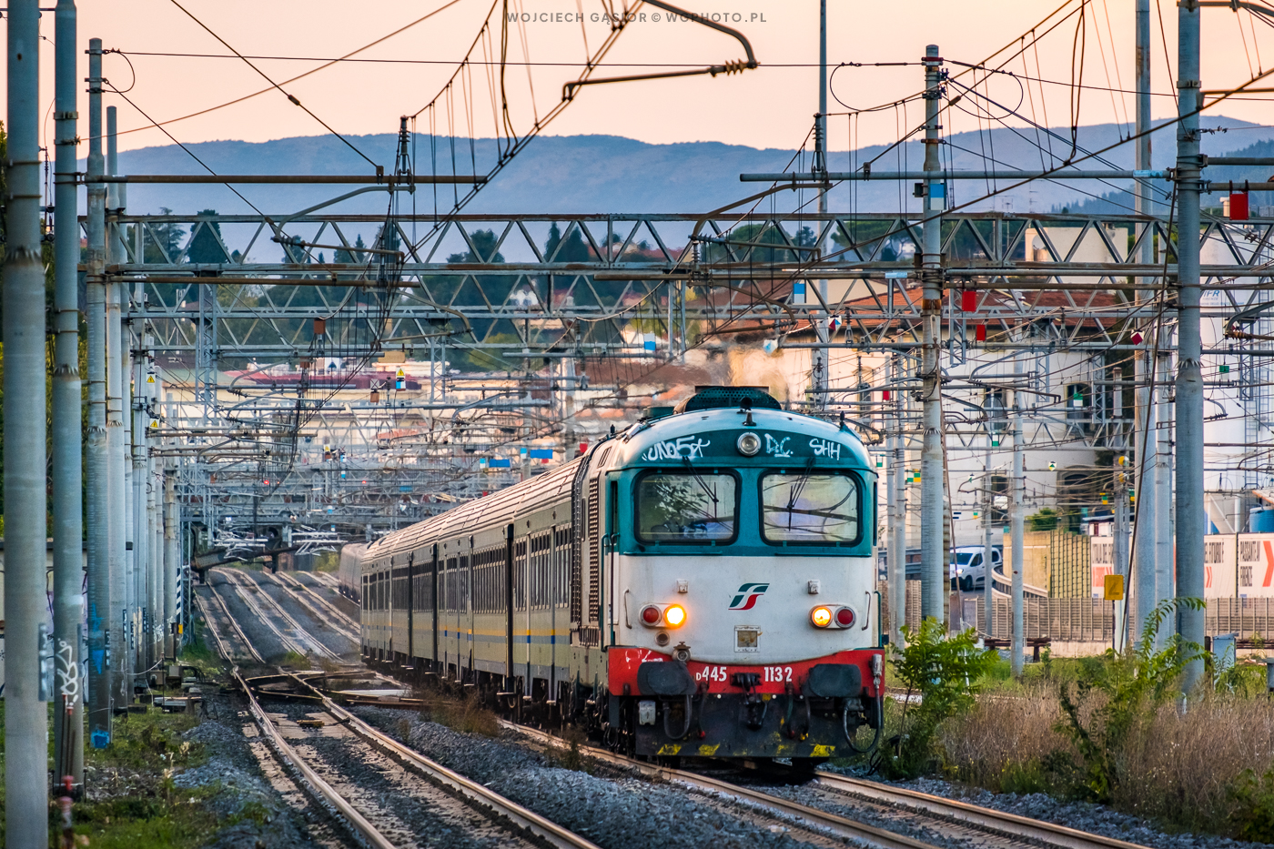 W nawiązaniu do poprzedniego – plan był taki, by pierwszego dnia wyjazdu znaleźć pociągi prowadzone Fiatami oraz jakieś miejscówki, a drugiego dnia je sfotografować. Trenitalia jednak uraczyła mnie całodobowym strajkiem (po włosku jak w tytule – warto zapamiętać to słówko na przyszłość). Na szczęście w rozkładzie jazdy oznaczone są kursy gwarantowane pomimo strajku, po 2-3 rano i popołudniu, gdy normalnie pociągi kursują mniej więcej co godzinę. Z poprzedniego dnia miałem już obczajone kursy wagonowe, więc pociąg był raczej pewny, tyle że w samej Florencji nie znalazłem bardziej porywających ujęć niż lufa z końca peronu i rozproszone światło o zachodzie słońca. D445-1132 z pociągiem R18969 Firenze Santa Maria Novella – Borgo San Lorenzo zatrzymuje się na stacji Firenze Campo di Marte. Skład wzmocniony jest z 5 do 7 wagonów, zapewne z powodu mniejszego uruchomienia w czasie strajku. Wagony jednak jechały na wpół puste, Włosi najwidoczniej zrezygnowali z podróży koleją tego dnia, podobnie jak i ja. 03.10.2025