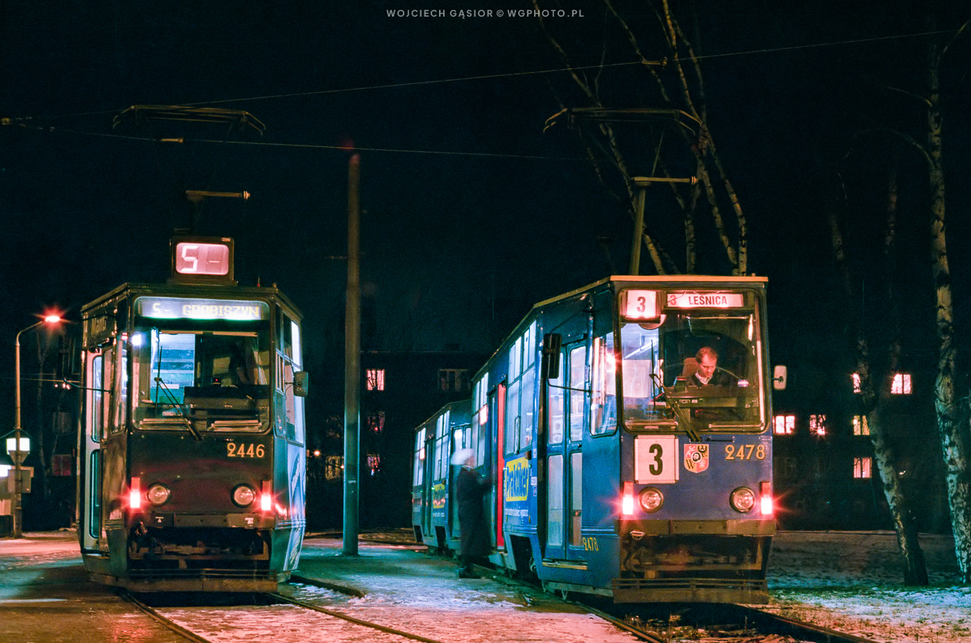 Wrocław, pętla Księże Małe, 105Na 2446+2445 i 2478+2479. Rzadko się zdarza postój tramwajów na obu torach, gdyż motorniczowie niechętnie wjeżdżają na prawy (na zdjęciu: lewy), położony w lekkim lewym łuku, z powodu którego nie widać drugiego wozu przy zamykaniu drzwi. 27.12.2001