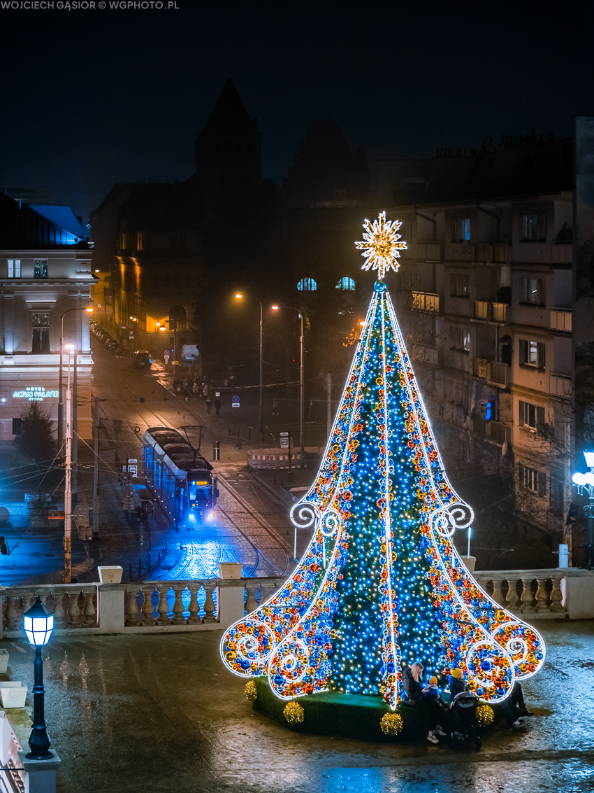 Wrocław, ul. Teatralna. Nieznany z numerów Moderus na linii 17 „w cieniu” choinki stojącej w niedawno zrewitalizowanym Bastionie Sakwowym. 20.12.2025
