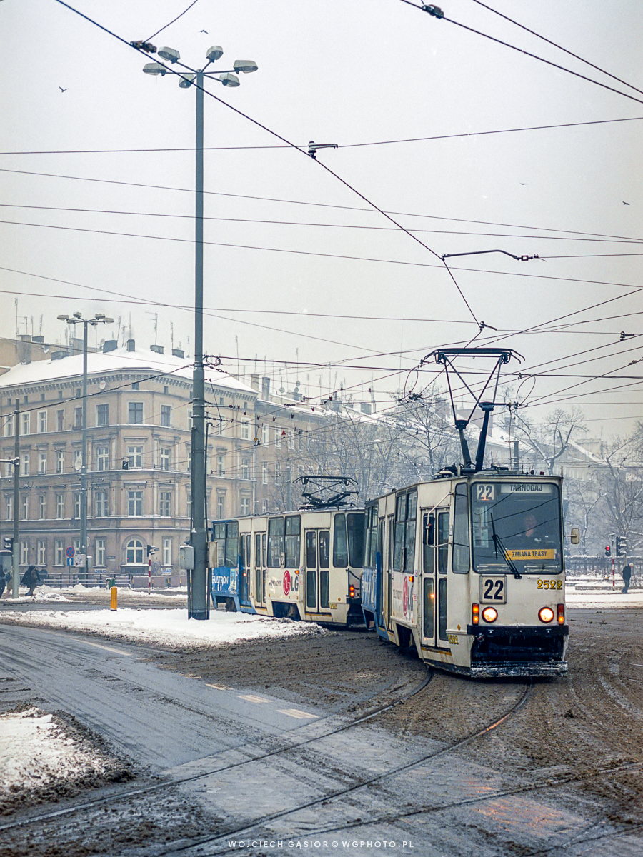 Wrocław, skrzyżowanie ul. Stanisława Dubois i Pomorskiej. 105N 2522+2521 na trasie doraźnego objazdu – o czym świadczy biała tablica z numerem linii oraz żółta „zmiana trasy” za szybą. 07.01.2004