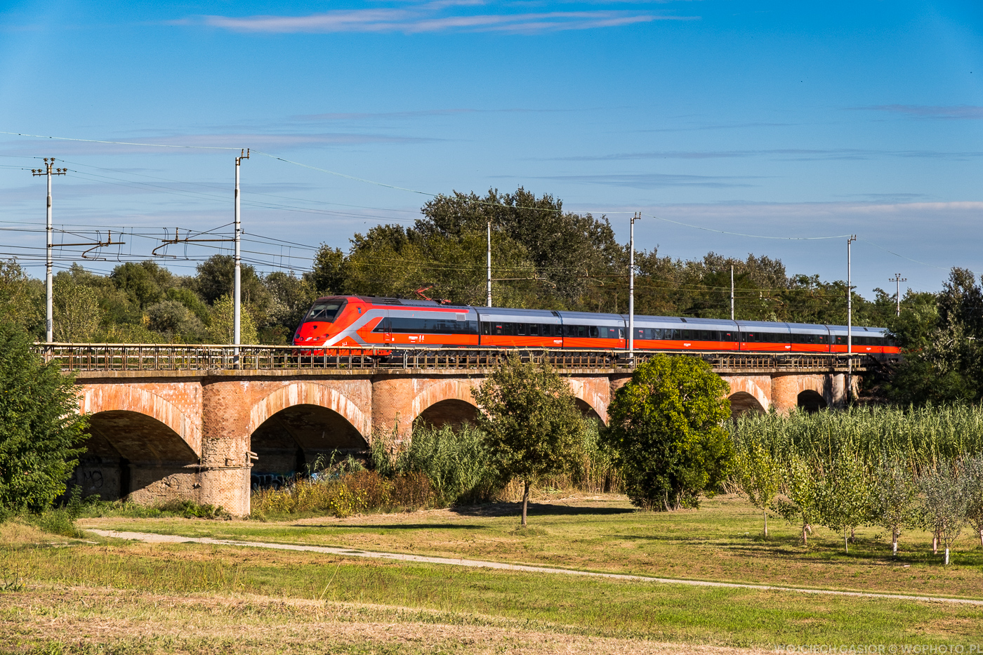 ETR500-24 jako Frecciarossa 8811 z Mediolanu do Lecce mija most nad rzeką Santerno niedaleko za stacją Imola. 04.10.2025