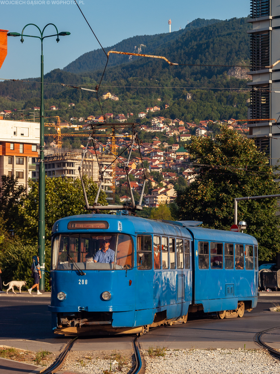 Sarajewo, ul. Halida Kajtaza. Tatra K2YU 288 wykręca właśnie na pętlę przy dworcu kolejowym. Nawet taki ciasny portret jadącego tramwaju może zawierać element krajobrazowy, pokazujący piękne położenie miasta. 24.08.2011