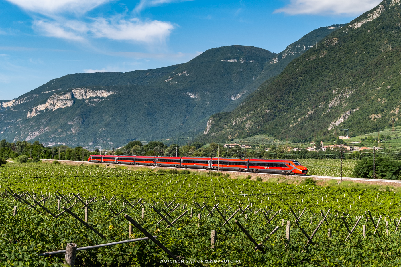 Jednostka serii ETR700 jako pociąg FR9721 relacji Bolzano-Bozen – Milano C.le przemierza dolinę Adygi na odcinku Avio – Borghetto sull’Adige. Zestawy ETR700 o prędkości maksymalnej 250 km/h zbudowano w latach 2004-2011 do obsługi połączeń między Amsterdamem a Brukselą. Problemy techniczne z produktami włoskiej AnsaldoBredy sprawiły, że niderlandzki projekt zamknięto, a pociągi zwrócono producentowi. W 2019 r. odkupiły je koleje włoskie. Obecnie kursują w siatce połączeń Frecciarossa, choć odbiegają nieco parametrami (chociażby vmax) od flagowych pociągów tej kategorii. 18.07.2025