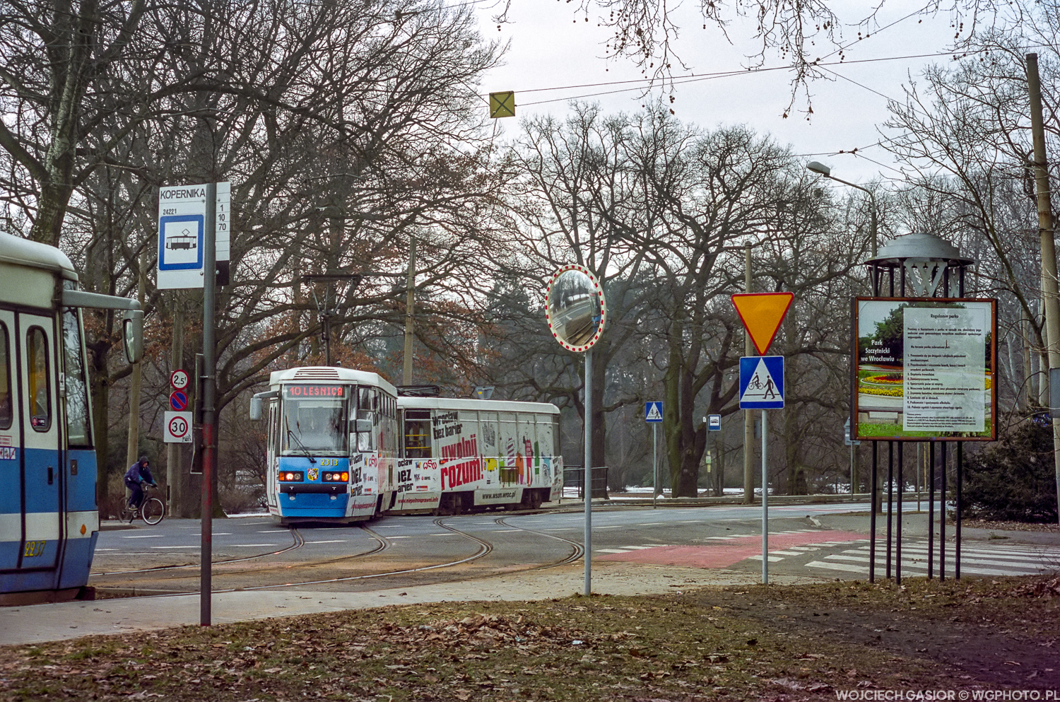 Wrocław, ul. Mickiewicza. Na pozbawionej skrajni esce przy ul. Kopernika mijają się składy 105NWr 2313+2332 i 2237+2236. Podoba mi się nawet to wpasowanie tramwaju pomiędzy pozorne przeszkadzajki, a w rzeczywistości motywem miał być witacz Parku Szczytnickiego z podobizną Hali Stulecia i charakterystycznym wrocławskim „W”. 25.03.2006