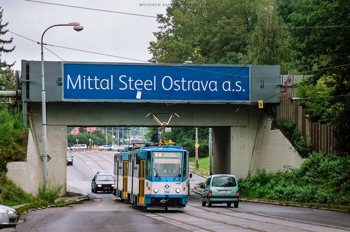 Ostrawa, ul. Vratimovská. Skład T6A5 1106+1110 wjeżdża na tereny leżące w bezpośrednim sąsiedztwie Nowej Huty. Gdyby tramwaj zjawił się parę sekund wcześniej, dopełnieniem zdjęcia byłaby zakładowa lokomotywa T448p, która przed momentem niespiesznie przetoczyła się po wiadukcie. 12.09.2007