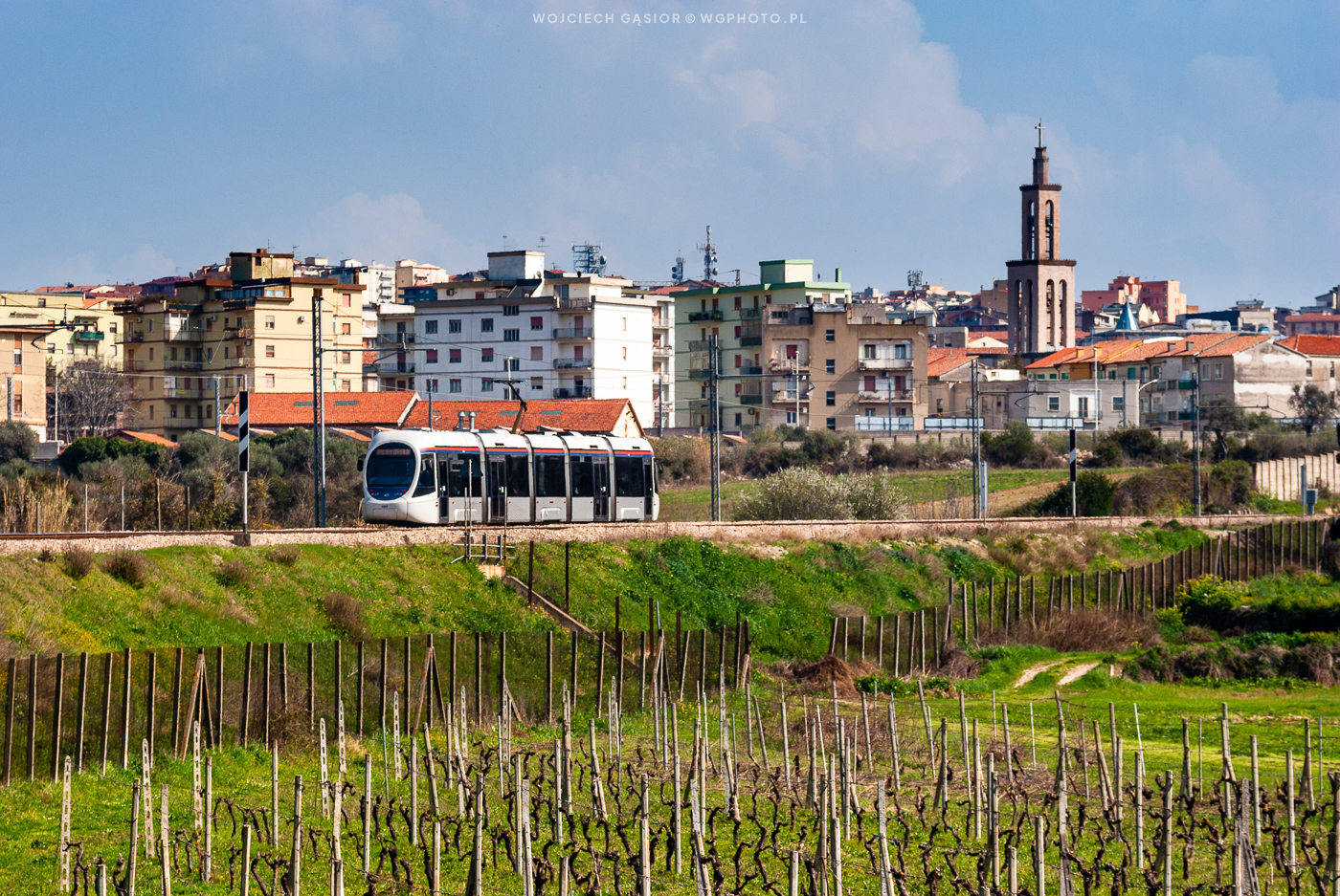 Santa Maria di Pisa – Stazione. Metrotramwaj pomyka w kierunku centrum Sassari. 2012-03-23