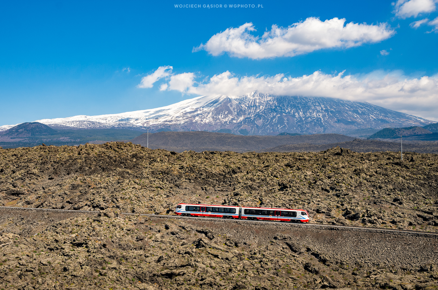 Jednostka DMU-002 Vulcano produkcji nowosądckiego Newagu, jadąc wokół Etny jako pociąg osobowy nr 32 relacji Randazzo – Catania Borgo, mija księżycowy krajobraz na obszarze lawy pochodzącej z erupcji z 1651 roku niedaleko Bronte. Szczyt wulkanu niestety nie chciał się odsłonić tego popołudnia. 30.03.2019