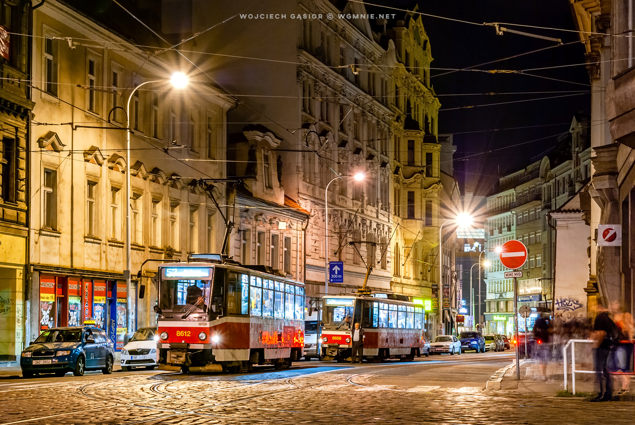 Praga, ul. Spálená. Na zwyczajnym skrzyżowaniu z przystankami dochodzonymi z chodnika dziewięć nocnych linii tramwajowych spotyka się co pół godziny przez całą noc (na zdjęciu Tatry T6A2 8612 i 8656). Stanowiska znajdują się na widocznej ulicy Spálenej oraz prostopadłej do niej Lazarskej. Znikomy bądź żaden ruch samochodowy oraz brak sygnalizacji świetlnych sprzyja swobodnemu przepływowi pasażerów między pojazdami. Miejsce to służy nocnym tramwajom już od 3 listopada 1985 roku. 2011-07-09